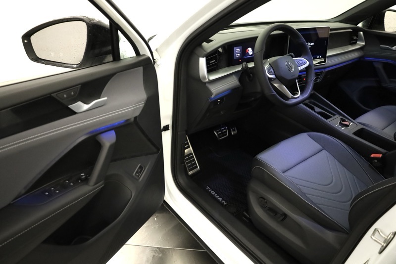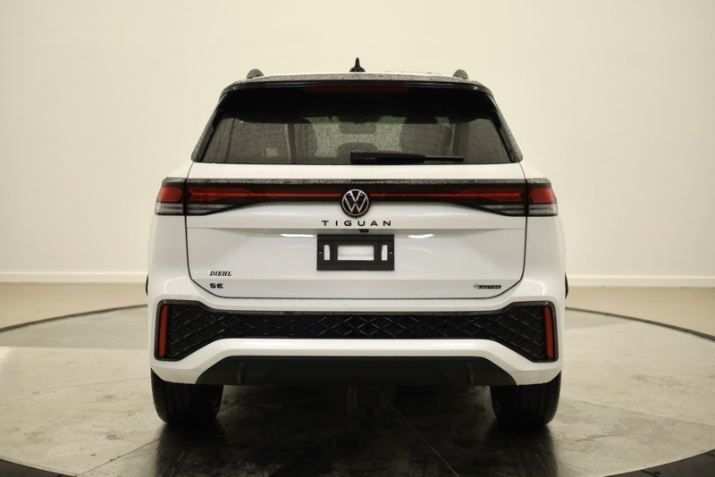 AWD, 4-Wheel Disc Brakes, 4-Wheel Independent Suspension, 7 Speakers, ABS brakes, Air Conditioning, Alloy wheels, AM/FM radio: SiriusXM with 360L, Auto High-beam Headlights, Auto-dimming Rear-View mirror, Automatic temperature control, Brake assist, Bumpers: body-color, Compass, Delay-off headlights, Driver door bin, Driver vanity mirror, Dual front impact airbags, Dual front side impact airbags, Electronic Stability Control, Emergency communication system, Exterior Parking Camera Rear, Four wheel independent suspension, Front anti-roll bar, Front Bucket Seats, Front Center Armrest, Front dual zone A/C, Front reading lights, Fully automatic headlights, Heads-Up Display, Heated door mirrors, Heated Front Seats, Heated front seats, Illuminated entry, Knee airbag, Leather Shift Knob, Leather steering wheel, Low tire pressure warning, Occupant sensing airbag, Outside temperature display, Overhead airbag, Overhead console, Panic alarm, Passenger door bin, Passenger vanity mirror, Perforated V-Tex Leatherette Seating Surfaces, Power door mirrors, Power driver seat, Power Liftgate, Power moonroof: Panoramic, Power steering, Power windows, Radio data system, Radio: MIB4 Composition Media Touchscreen with AM/FM, Rain sensing wipers, Rear anti-roll bar, Rear reading lights, Rear seat center armrest, Rear side impact airbag, Rear window defroster, Rear window wiper, Remote keyless entry, Security system, Speed control, Speed-sensing steering, Split folding rear seat, Spoiler, Sport steering wheel, Steering wheel mounted audio controls, Tachometer, Telescoping steering wheel, Tilt steering wheel, Traction control, Trip computer, Turn signal indicator mirrors, Variably intermittent wipers, Wheels: 20" Black Painted Alloy. opal white pearl 2026 Volkswagen Tiguan 2.0T SE R-Line Black AWD 8-Speed Automatic 2.0L TSI DOHC