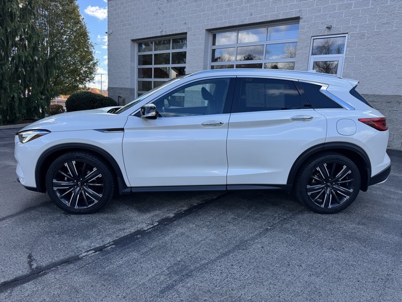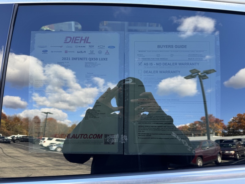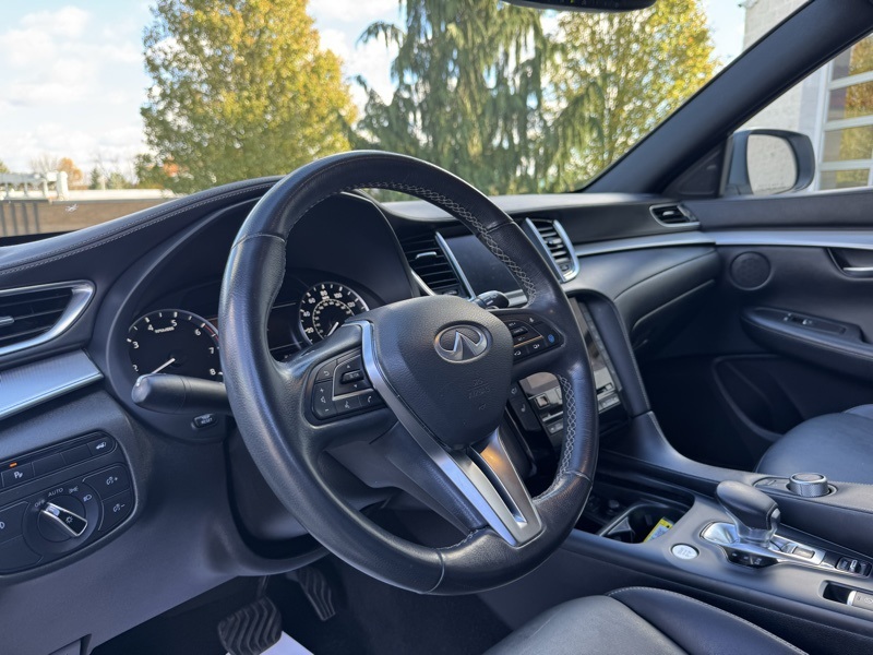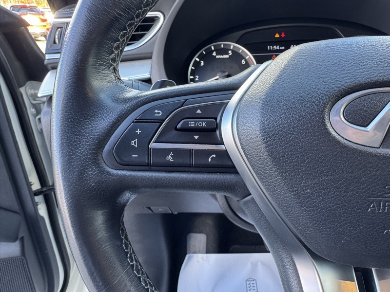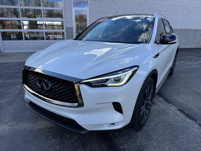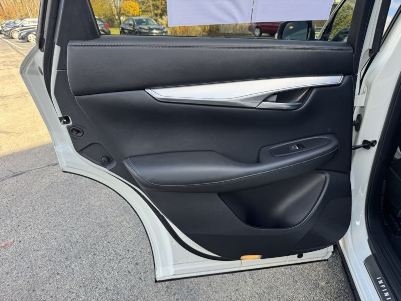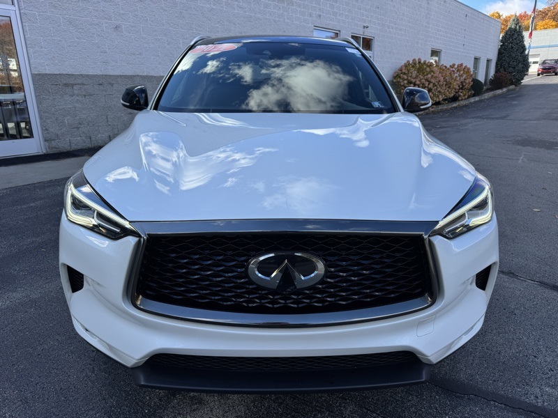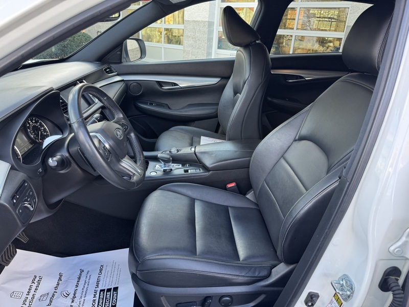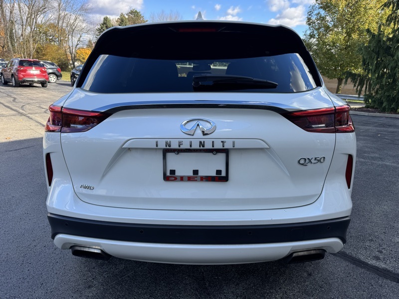 Majestic White 2021 INFINITI QX50 LUXE 4D Sport Utility AWD I4 CVT Appearance Package (Black Grille Mesh, Black Outside Mirror Caps, Body Color Rear Diffuser, Dark Chrome Front Fender Accent, Dark Chrome Front Grille Surround, Dark Chrome Tailgate Finisher, Graphite Headliner, Heated Outside Mirrors, and Wheels: 20" Black and Machine Finished), Cargo Package, 4-Wheel Disc Brakes, 5.846 Axle Ratio, 6 Speakers, ABS brakes, Air Conditioning, Alloy wheels, AM/FM radio: SiriusXM, AM/FM/CD Audio System, Anti-whiplash front head restraints, Apple CarPlay/Android Auto, Auto High-beam Headlights, Auto-dimming Rear-View mirror, Automatic temperature control, Brake assist, Bumpers: body-color, CD player, Delay-off headlights, Driver door bin, Driver vanity mirror, Dual front impact airbags, Dual front side impact airbags, Electronic Stability Control, Emergency communication system: INFINITI InTouch, Exterior Parking Camera Rear, Floor Mats, Four wheel independent suspension, Front anti-roll bar, Front Bucket Seats, Front Center Armrest, Front dual zone A/C, Front fog lights, Front reading lights, Garage door transmitter: HomeLink, Heated Front Bucket Seats, Heated front seats, Illuminated entry, Illuminated Kick Plates, Knee airbag, Leather Shift Knob, Leatherette Seat Trim, Literature Kit, Low tire pressure warning, Occupant sensing airbag, Outside temperature display, Overhead airbag, Overhead console, Panic alarm, Passenger door bin, Passenger vanity mirror, Power door mirrors, Power driver seat, Power Liftgate, Power moonroof, Power passenger seat, Power steering, Power windows, Radio data system, Rear anti-roll bar, Rear Parking Sensors, Rear reading lights, Rear seat center armrest, Rear side impact airbag, Rear window defroster, Rear window wiper, Remote keyless entry, Security system, Speed control, Speed-sensing steering, Speed-Sensitive Wipers, Splash Guards (Set of 4), Split folding rear seat, Spoiler, Steering wheel mounted audio controls, Tachometer, Telescoping steering wheel, Tilt steering wheel, Traction control, Trip computer, Turn signal indicator mirrors, Variably intermittent wipers, Welcome Lighting, and Wheels: 19" x 7.5J Silver Painted Alloy. 22/28 City/Highway MPG