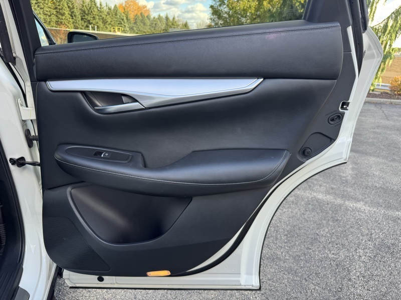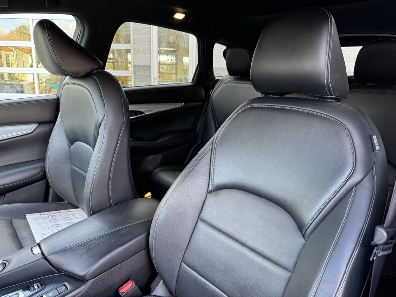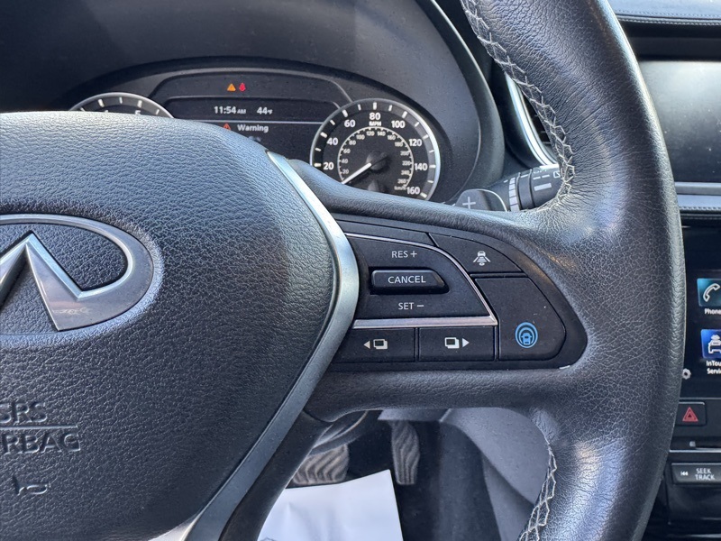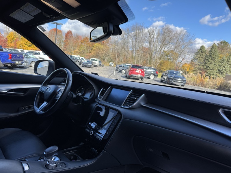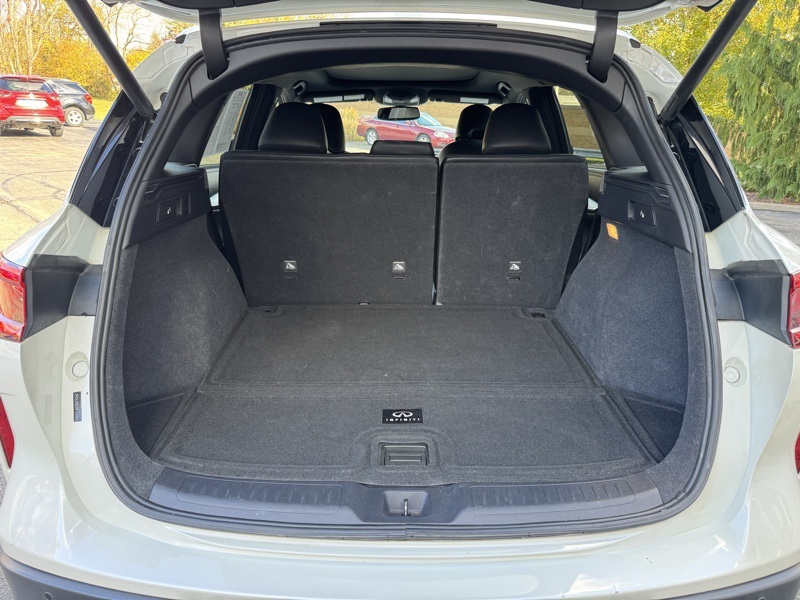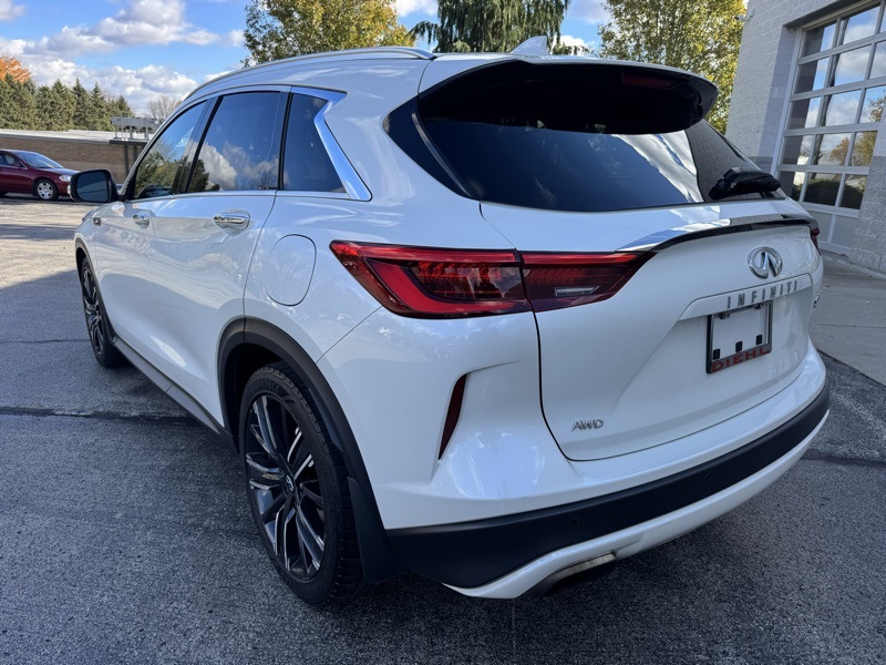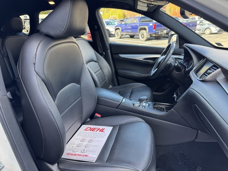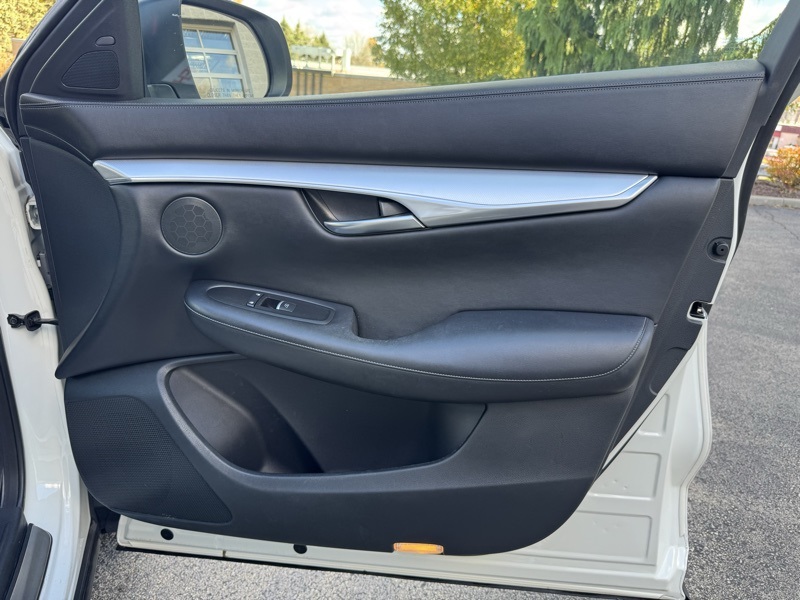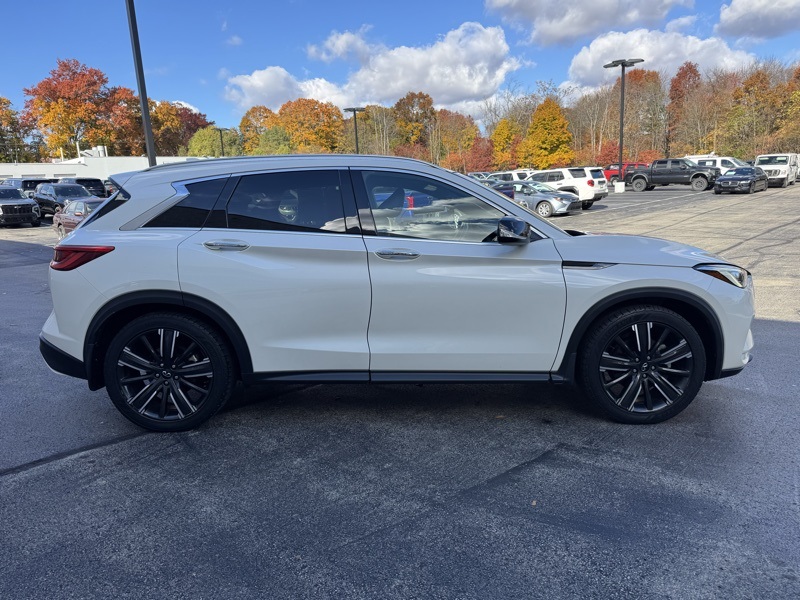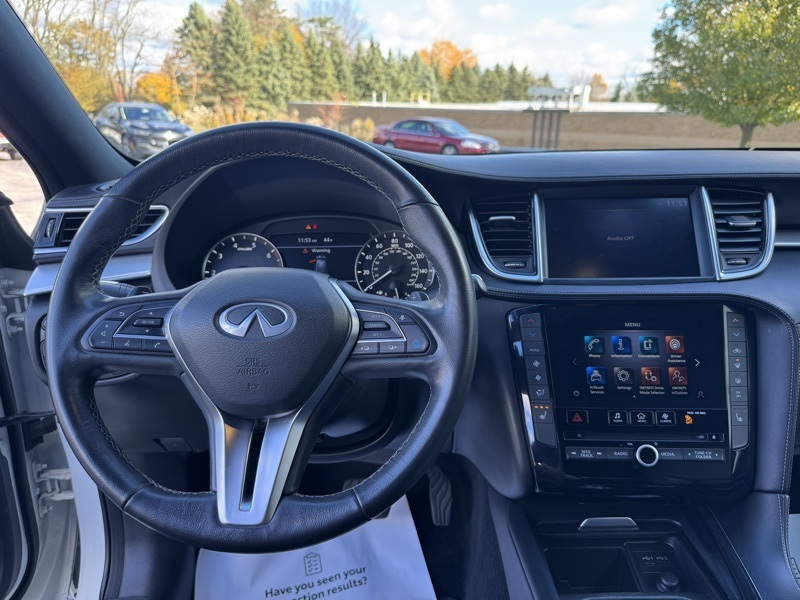 Majestic White 2021 INFINITI QX50 LUXE 4D Sport Utility AWD I4 CVT Appearance Package (Black Grille Mesh, Black Outside Mirror Caps, Body Color Rear Diffuser, Dark Chrome Front Fender Accent, Dark Chrome Front Grille Surround, Dark Chrome Tailgate Finisher, Graphite Headliner, Heated Outside Mirrors, and Wheels: 20" Black and Machine Finished), Cargo Package, 4-Wheel Disc Brakes, 5.846 Axle Ratio, 6 Speakers, ABS brakes, Air Conditioning, Alloy wheels, AM/FM radio: SiriusXM, AM/FM/CD Audio System, Anti-whiplash front head restraints, Apple CarPlay/Android Auto, Auto High-beam Headlights, Auto-dimming Rear-View mirror, Automatic temperature control, Brake assist, Bumpers: body-color, CD player, Delay-off headlights, Driver door bin, Driver vanity mirror, Dual front impact airbags, Dual front side impact airbags, Electronic Stability Control, Emergency communication system: INFINITI InTouch, Exterior Parking Camera Rear, Floor Mats, Four wheel independent suspension, Front anti-roll bar, Front Bucket Seats, Front Center Armrest, Front dual zone A/C, Front fog lights, Front reading lights, Garage door transmitter: HomeLink, Heated Front Bucket Seats, Heated front seats, Illuminated entry, Illuminated Kick Plates, Knee airbag, Leather Shift Knob, Leatherette Seat Trim, Literature Kit, Low tire pressure warning, Occupant sensing airbag, Outside temperature display, Overhead airbag, Overhead console, Panic alarm, Passenger door bin, Passenger vanity mirror, Power door mirrors, Power driver seat, Power Liftgate, Power moonroof, Power passenger seat, Power steering, Power windows, Radio data system, Rear anti-roll bar, Rear Parking Sensors, Rear reading lights, Rear seat center armrest, Rear side impact airbag, Rear window defroster, Rear window wiper, Remote keyless entry, Security system, Speed control, Speed-sensing steering, Speed-Sensitive Wipers, Splash Guards (Set of 4), Split folding rear seat, Spoiler, Steering wheel mounted audio controls, Tachometer, Telescoping steering wheel, Tilt steering wheel, Traction control, Trip computer, Turn signal indicator mirrors, Variably intermittent wipers, Welcome Lighting, and Wheels: 19" x 7.5J Silver Painted Alloy. 22/28 City/Highway MPG