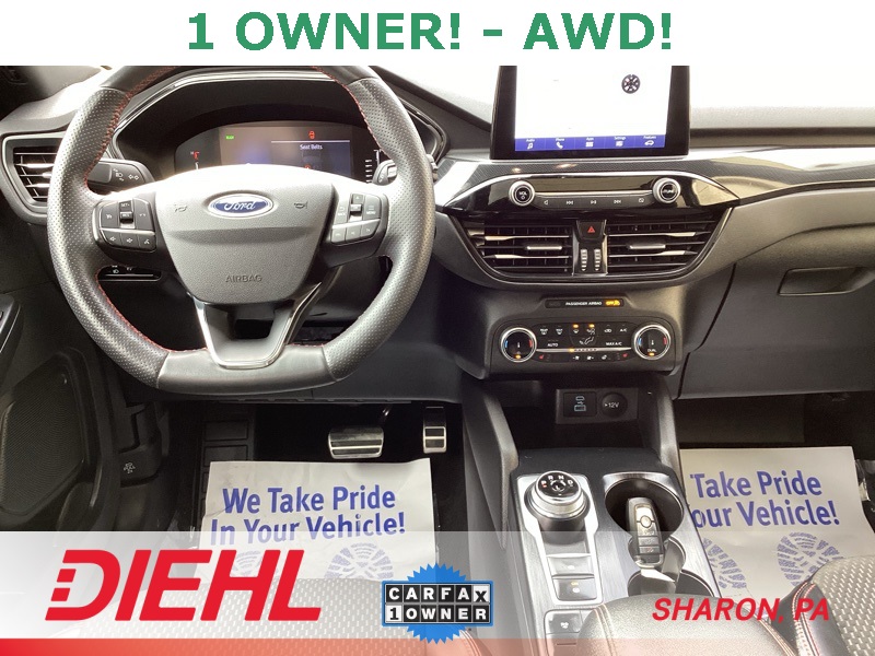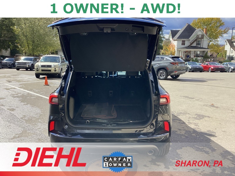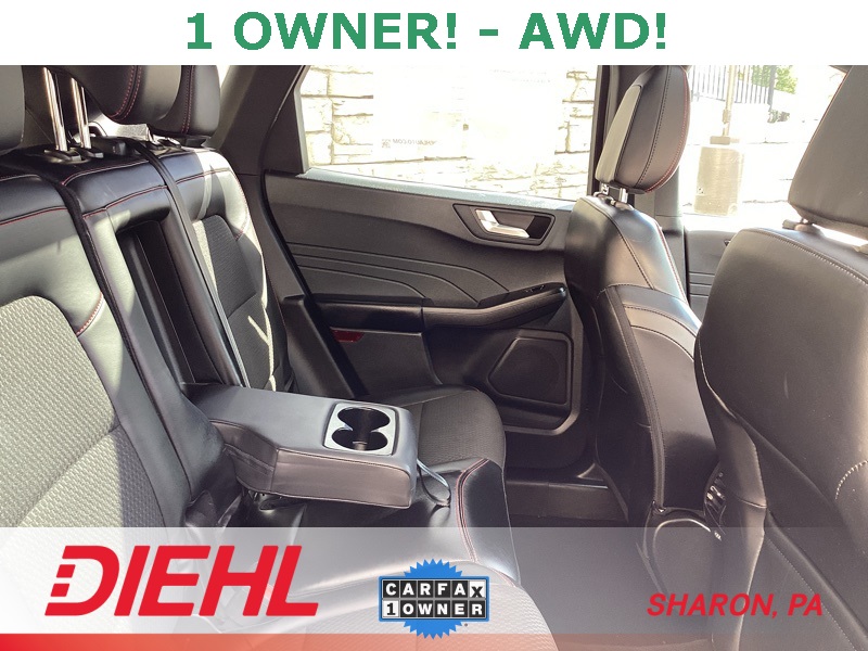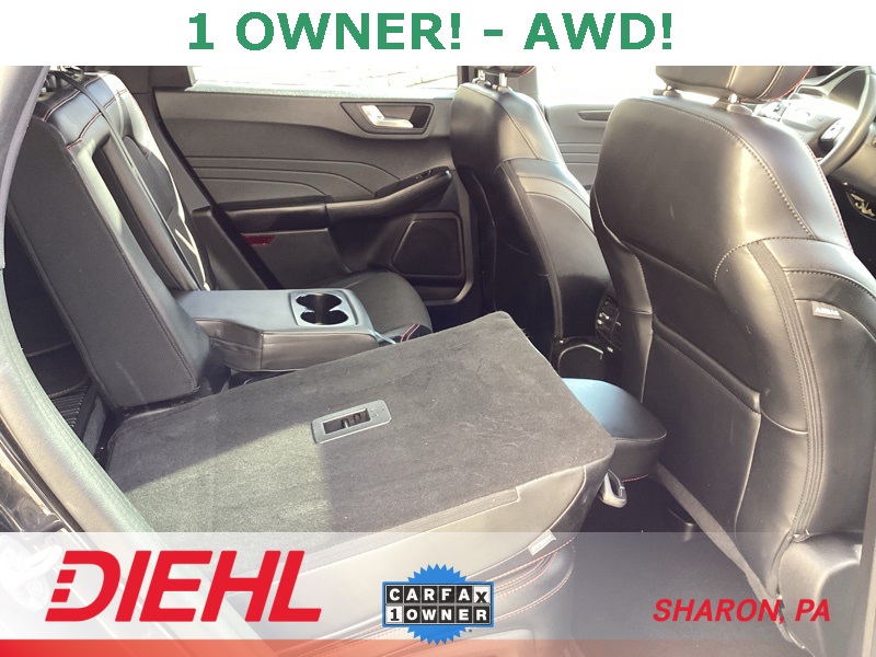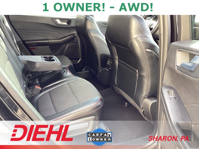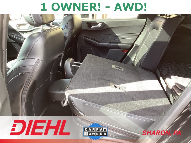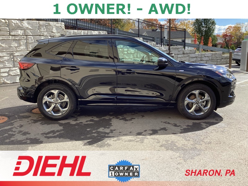**ONE-OWNER**, **HEATED SEATS**, **BACKUP CAMERA**, **APPLE CAR PLAY**, **ANDROID AUTO**, 2.5L iVCT, 2.91 Axle Ratio, 4-Wheel Disc Brakes, 6 Speakers, ABS brakes, Air Conditioning, Alloy wheels, AM/FM radio: SiriusXM, AM/FM Stereo, Auto High-beam Headlights, Automatic temperature control, Black Roof-Rack Side Rails, Brake assist, Bumpers: body-color, Cargo Mat, Compass, Delay-off headlights, Driver door bin, Driver vanity mirror, Dual front impact airbags, Dual front side impact airbags, Easy Access Cargo Shade, Electronic Fuel Door Release, Electronic Stability Control, Emergency communication system: SYNC 4 911 Assist, Engine Block Heater, Equipment Group 400A, Exterior Parking Camera Rear, FordPass Connect, Four wheel independent suspension, Front & Rear Floor Liners w/Carpet Mats, Front anti-roll bar, Front Bucket Seats, Front Center Armrest, Front dual zone A/C, Front fog lights, Front reading lights, Fully automatic headlights, Heated door mirrors, Heated front seats, Heated steering wheel, Heated Vinyl/Cloth Front Sport Contour Bucket Seats, Illuminated entry, Knee airbag, Low tire pressure warning, Neutral Towing Capability, Occupant sensing airbag, Outside temperature display, Overhead airbag, Overhead console, Panic alarm, Panoramic Vista Roof, Passenger door bin, Passenger vanity mirror, Pedestrian Alert Sounder, Power door mirrors, Power driver seat, Power Liftgate, Power steering, Power windows, Radio data system, Rear anti-roll bar, Rear reading lights, Rear seat center armrest, Rear window defroster, Rear window wiper, Remote keyless entry, Speed control, Speed-sensing steering, Speed-Sensitive Wipers, Split folding rear seat, Spoiler, Sport steering wheel, Steering wheel mounted audio controls, SYNC 4, Tachometer, Telescoping steering wheel, Tilt steering wheel, Traction control, Trip computer, Variably intermittent wipers, Wheels: 18" Rock Metallic Painted Aluminum. Black Metallic 2023 Ford Escape Hybrid ST-Line Select AWD eCVT 2.5L iVCT