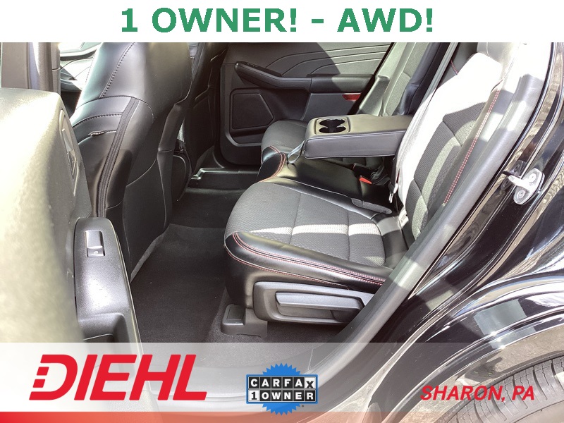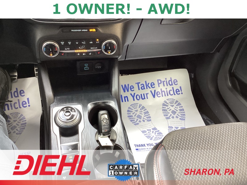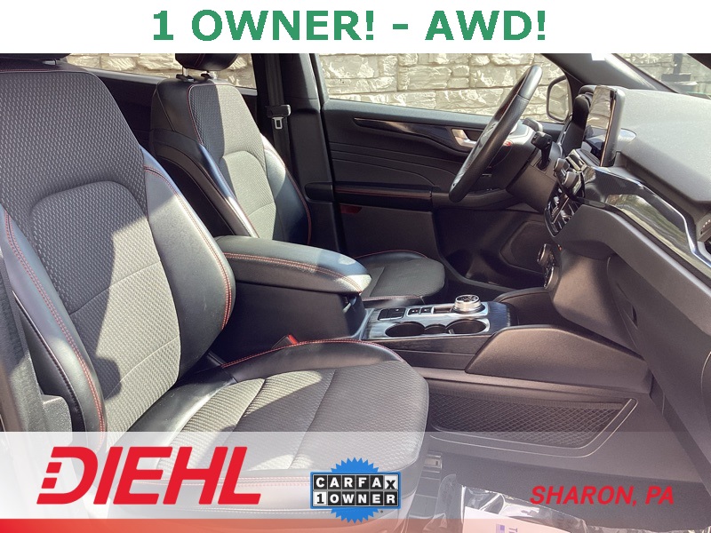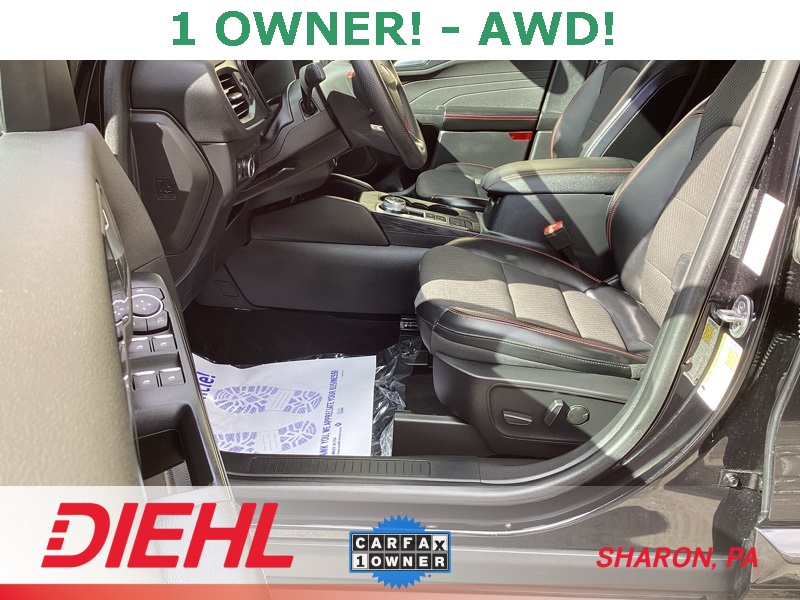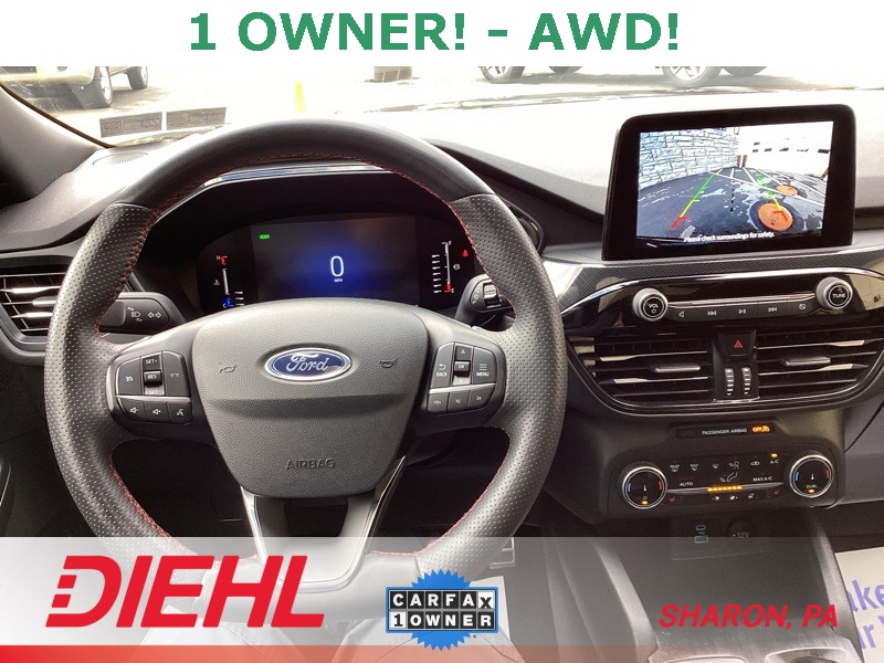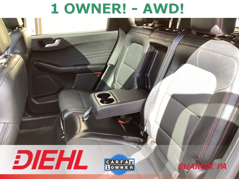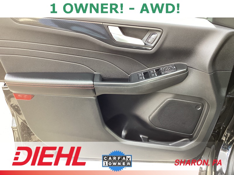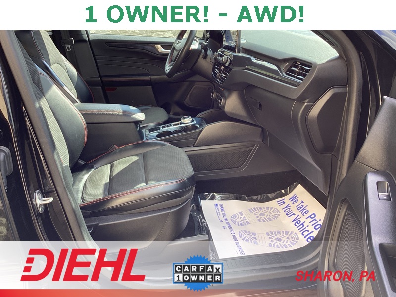 **ONE-OWNER**, **HEATED SEATS**, **BACKUP CAMERA**, **APPLE CAR PLAY**, **ANDROID AUTO**, 2.5L iVCT, 2.91 Axle Ratio, 4-Wheel Disc Brakes, 6 Speakers, ABS brakes, Air Conditioning, Alloy wheels, AM/FM radio: SiriusXM, AM/FM Stereo, Auto High-beam Headlights, Automatic temperature control, Black Roof-Rack Side Rails, Brake assist, Bumpers: body-color, Cargo Mat, Compass, Delay-off headlights, Driver door bin, Driver vanity mirror, Dual front impact airbags, Dual front side impact airbags, Easy Access Cargo Shade, Electronic Fuel Door Release, Electronic Stability Control, Emergency communication system: SYNC 4 911 Assist, Engine Block Heater, Equipment Group 400A, Exterior Parking Camera Rear, FordPass Connect, Four wheel independent suspension, Front & Rear Floor Liners w/Carpet Mats, Front anti-roll bar, Front Bucket Seats, Front Center Armrest, Front dual zone A/C, Front fog lights, Front reading lights, Fully automatic headlights, Heated door mirrors, Heated front seats, Heated steering wheel, Heated Vinyl/Cloth Front Sport Contour Bucket Seats, Illuminated entry, Knee airbag, Low tire pressure warning, Neutral Towing Capability, Occupant sensing airbag, Outside temperature display, Overhead airbag, Overhead console, Panic alarm, Panoramic Vista Roof, Passenger door bin, Passenger vanity mirror, Pedestrian Alert Sounder, Power door mirrors, Power driver seat, Power Liftgate, Power steering, Power windows, Radio data system, Rear anti-roll bar, Rear reading lights, Rear seat center armrest, Rear window defroster, Rear window wiper, Remote keyless entry, Speed control, Speed-sensing steering, Speed-Sensitive Wipers, Split folding rear seat, Spoiler, Sport steering wheel, Steering wheel mounted audio controls, SYNC 4, Tachometer, Telescoping steering wheel, Tilt steering wheel, Traction control, Trip computer, Variably intermittent wipers, Wheels: 18" Rock Metallic Painted Aluminum. Black Metallic 2023 Ford Escape Hybrid ST-Line Select AWD eCVT 2.5L iVCT